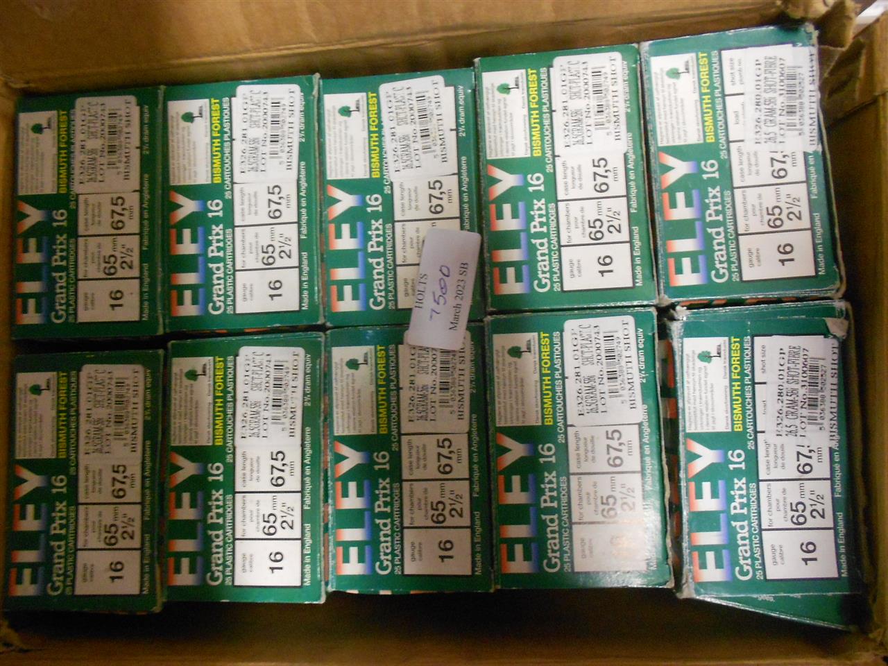 250 ELEY GP FOREST 16 BORE BISMUTH CARTRIDGES, 5 Bi, 67.5mm, 26.5grm, Please be advised that cartridges/ammunition, primers, primed cases, blanks and percussion caps cannot be sent or exported to you by post or carrier. Due to this rule, within 30 days of the sale date, please arrange with our shipping department a collection at one of our regional valuation days on mainland UK, or, you would be most welcome to collect from our offices at PE31 6HA in Norfolk. If collection is not arranged within 30 days, that will indicate that the items are not required and they will be offered in our next sale.