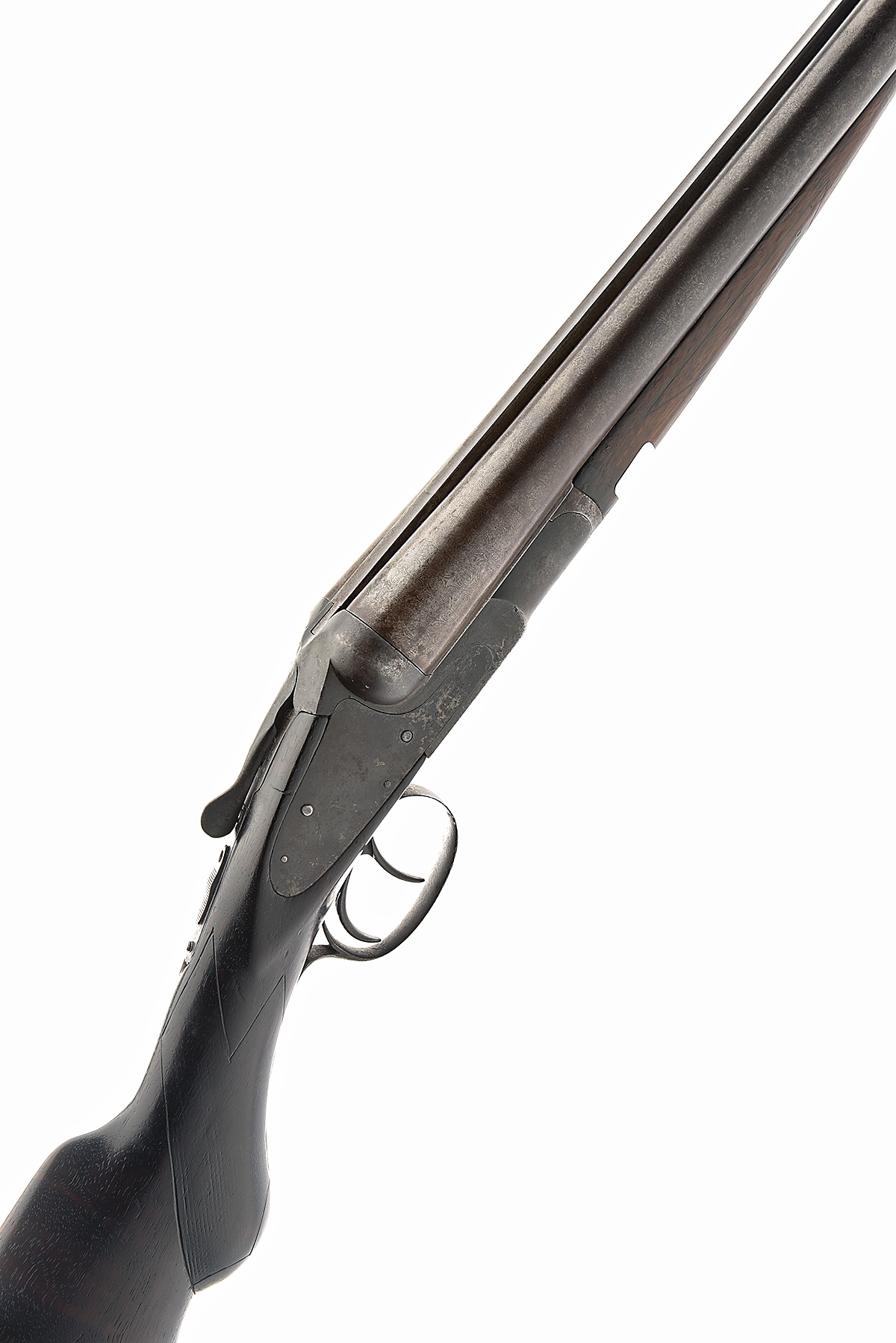 L.C. SMITH 10-BORE (2 7/8IN.) 'No. 0' SIDELOCK NON-EJECTOR, serial no. 309971, for 1906, 32in. bold damascus barrels with raised tapered file-cut rib (internally pitted), 2 7/8in. chambers, bored approx. full choke, hold-open toplever, manual safety (at fault), plain finish (numerous hammer markings and screwheads heavily burred), 13 3/4in. semi-pistolgrip stock including later buttplate, weight 10lb. 3oz.