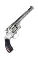 with 6 1/2in. barrel, the top rib stamped with the Smith & Wesson patent and address legends, top break-action and six shot fluted cylinder, two-piece chequered hard rubber grips embellished with the intertwined 'S & W' motif, the revolver with traces of its original nickel plating, and scattered areas of pitting