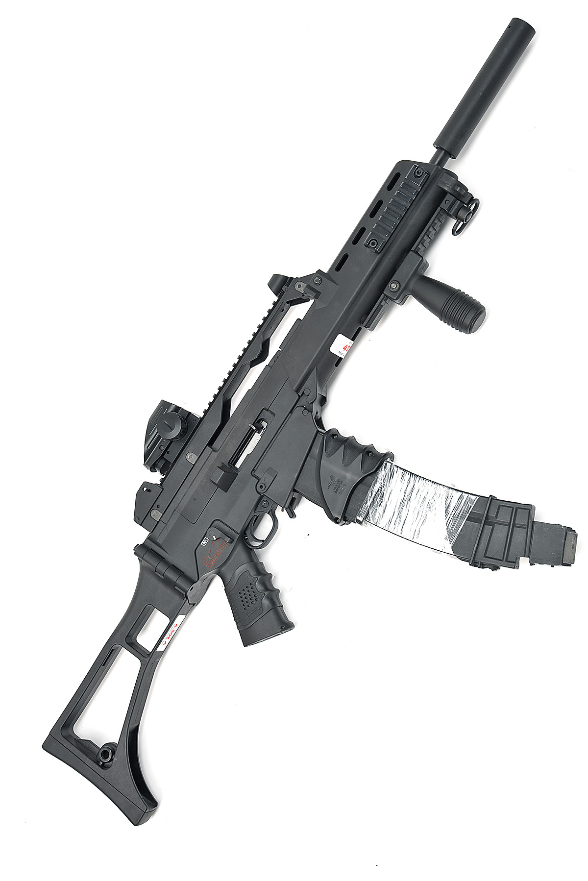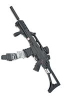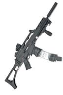 ARCHANGEL 'MARAUDER' .22 SELF-LOADING RIFLE, serial no. 356-21760, recent, 19in. nitro barrel, military style outer kit resembling an HK G36 and utilising a Ruger 10/22 action, barrel sleeve to appear as a moderator, various picatinny rails for sights and accessories, the top rail with a Pinty red/green reflex sight, dummy safe/single/auto switches (safety on triggerguard), sling swivels, folding stock, spare magazine, both magazines with dummy extensions, weight 8lb. 11oz.