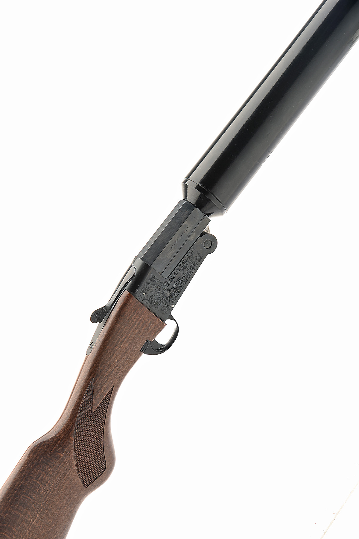 ENRICO PEDRETTI 12-BORE 'DIANA MOD.105 - GUNSPORT HUSHPOWER' SINGLE-BARRELLED MODERATED SHOTGUN, serial no. 973, for 1996, 31 1/2in. (80cm) nitro barrel including sound moderator, 2 3/4in. chamber, manual push-button safety, blacked action with acanthus scroll engraving, 14 1/4in. semi-pistolgrip stock including buttplate