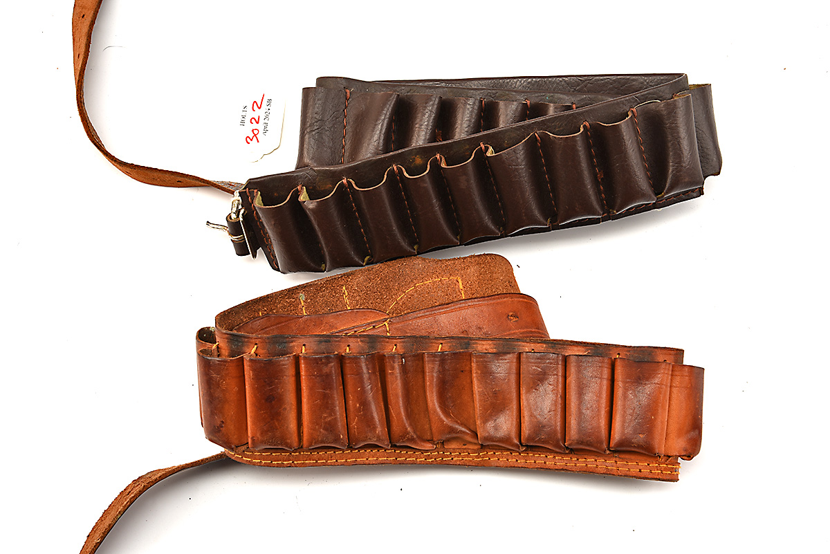 A PAIR OF LEATHER CARTRIDGE BELTS FOR 12-BORE, in dark brown & tan, belt in tan is damaged to one shell holders. 2