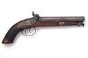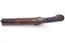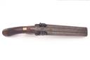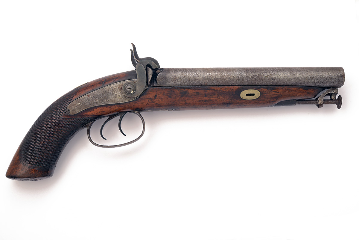 A 16-BORE PERCUSSION DOUBLE-BARRELLED HOWDAH-PISTOL, UNSIGNED, no visible serial number, circa 1845, with side by side 8 1/2in. barrels, borderline engraved back-action locks, walnut full-stock with chequered grip and stirrup rammer (stirrup as found), exposed iron surfaces shallow pitted