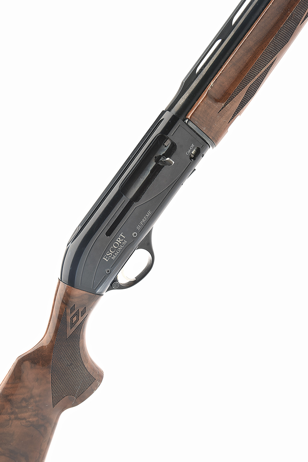 HATSAN 12-BORE (3IN.) 'ESCORT MAGNUM SUPREME' SEMI-AUTO SHOTGUN, serial no. 338694, circa 2013, restricted magazine, 28in. steel-shot proved nitro barrel with 7mm raised ventilated matt rib, 3in. chamber, multichoke (no spares), manual push-button safety, magazine cut-off switch missing, plain blacked action, 14 1/2in. pistolgrip stock including rubber recoil pad