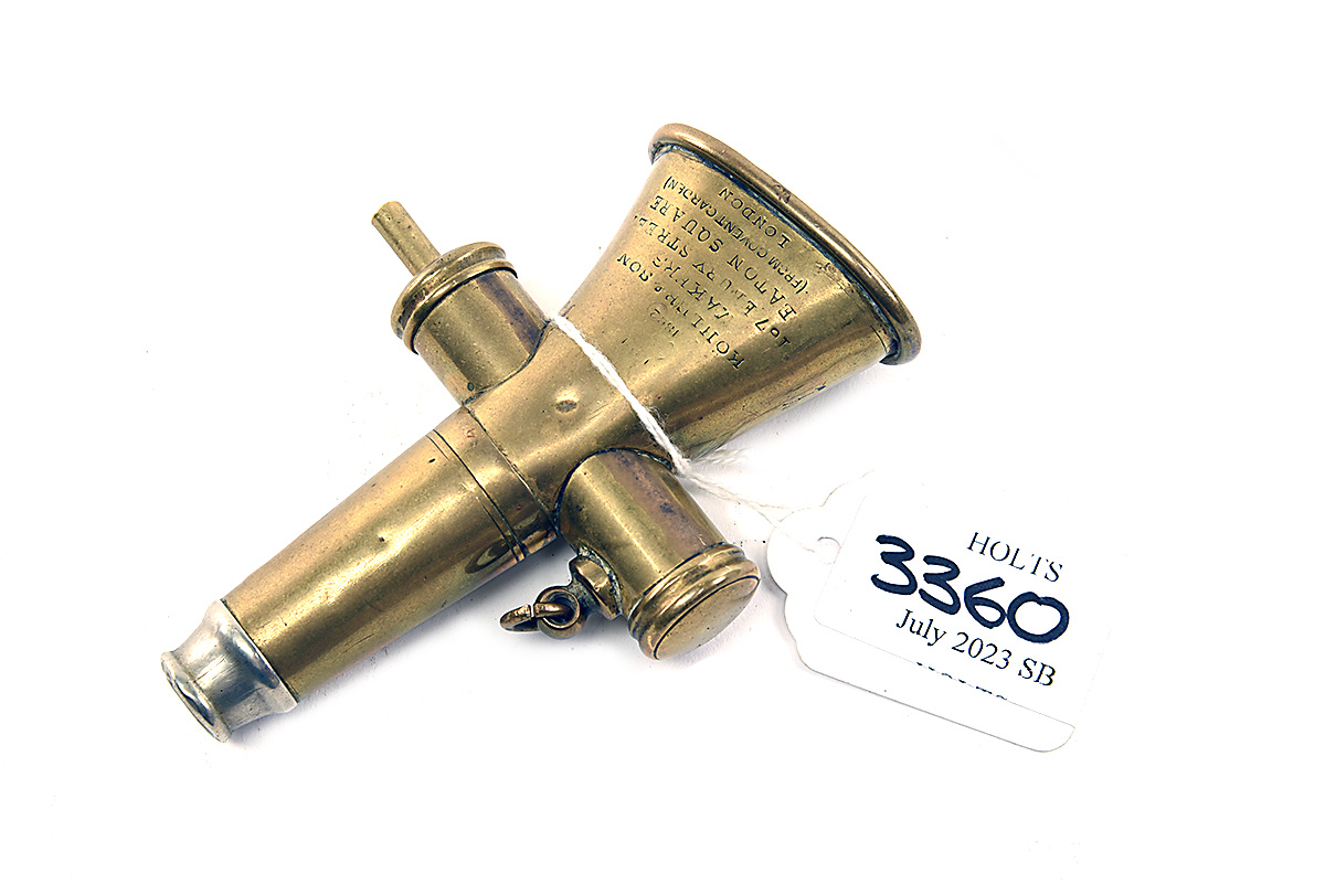 A KOHLER SIGNAL HORN, curved brass body, white metal mouthpiece, two tone horn with single fingering button to control valve, made by Kohler & Son, 167 Ebury Street, Eaton Square (from Covent Garden), London, approximately 4 1/2in. long