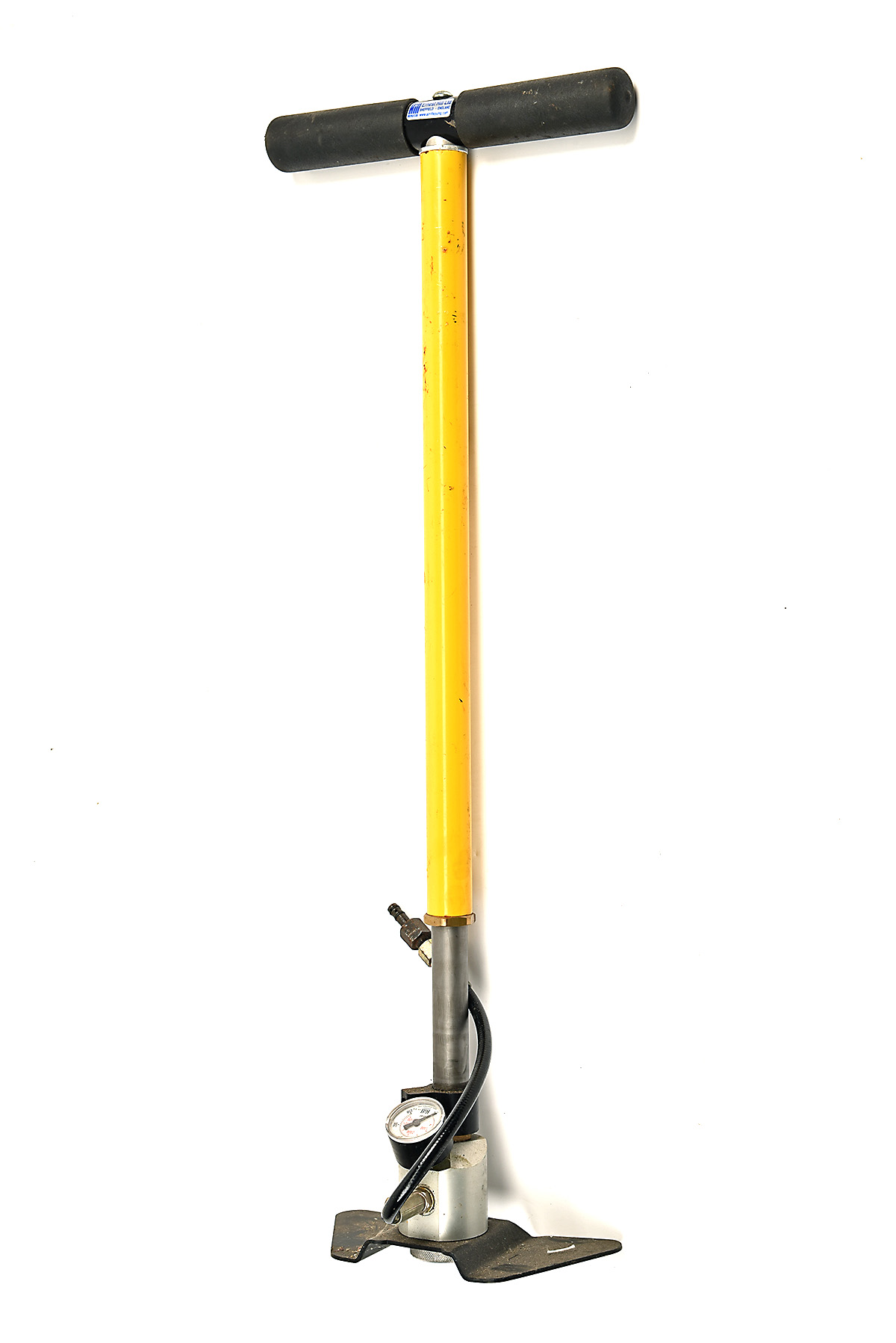 AN ERNEST HILL PRE-CHARGED PNEUMATIC STIRRUP-PUMP, trademarked for BSA, yellow finish