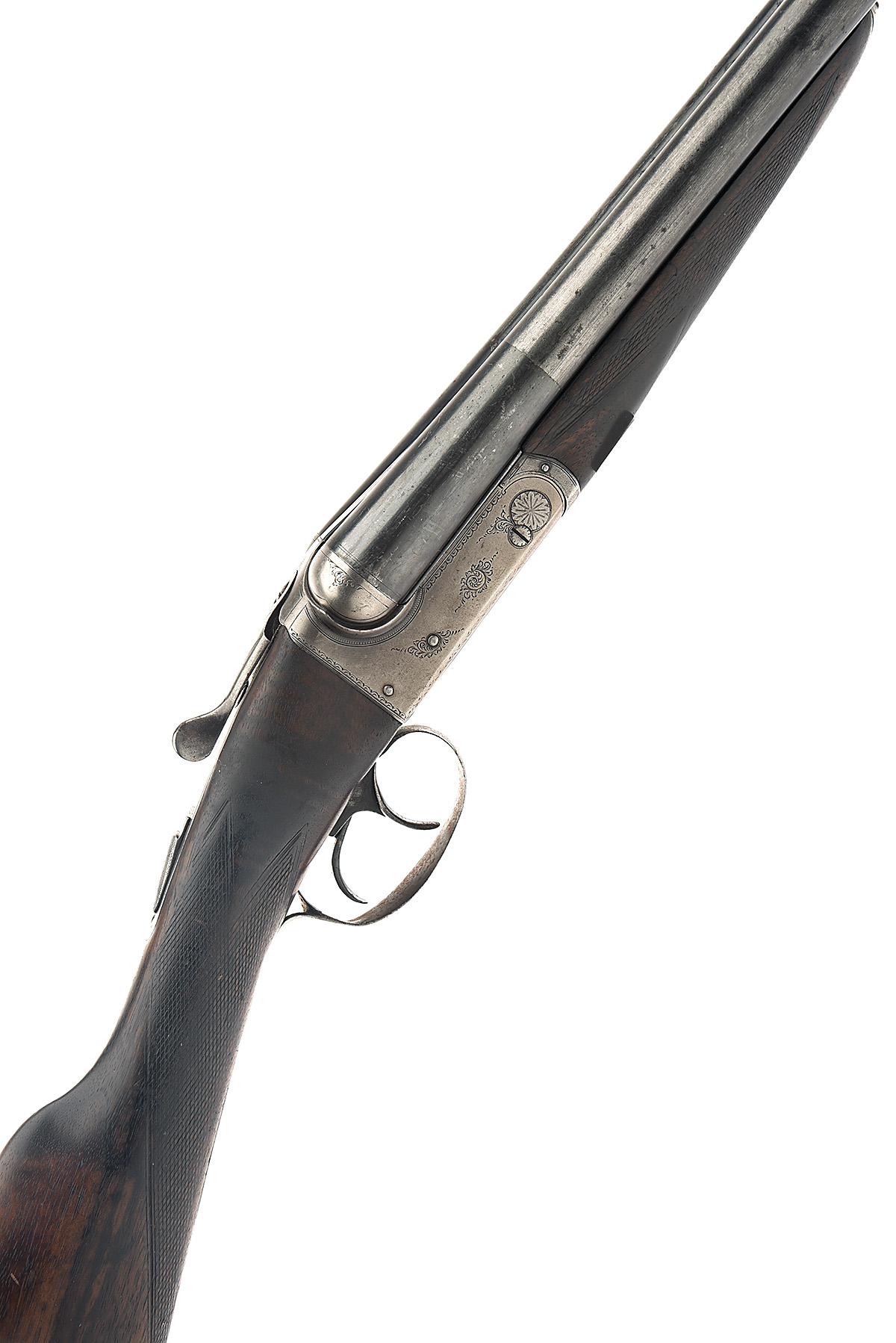BSA 12-BORE 'CROSSOVER' BOXLOCK EJECTOR, serial no. 49019, circa 1930, 28in. sleeved nitro barrels, 2 1/2in. chambers, bored approx. 1/4 and 3/4 choke, automatic safety with gold-inlaid 'SAFE' detail, border and partial scroll engraving, 14 1/4in. figured crossover stock (right shoulder left eye)