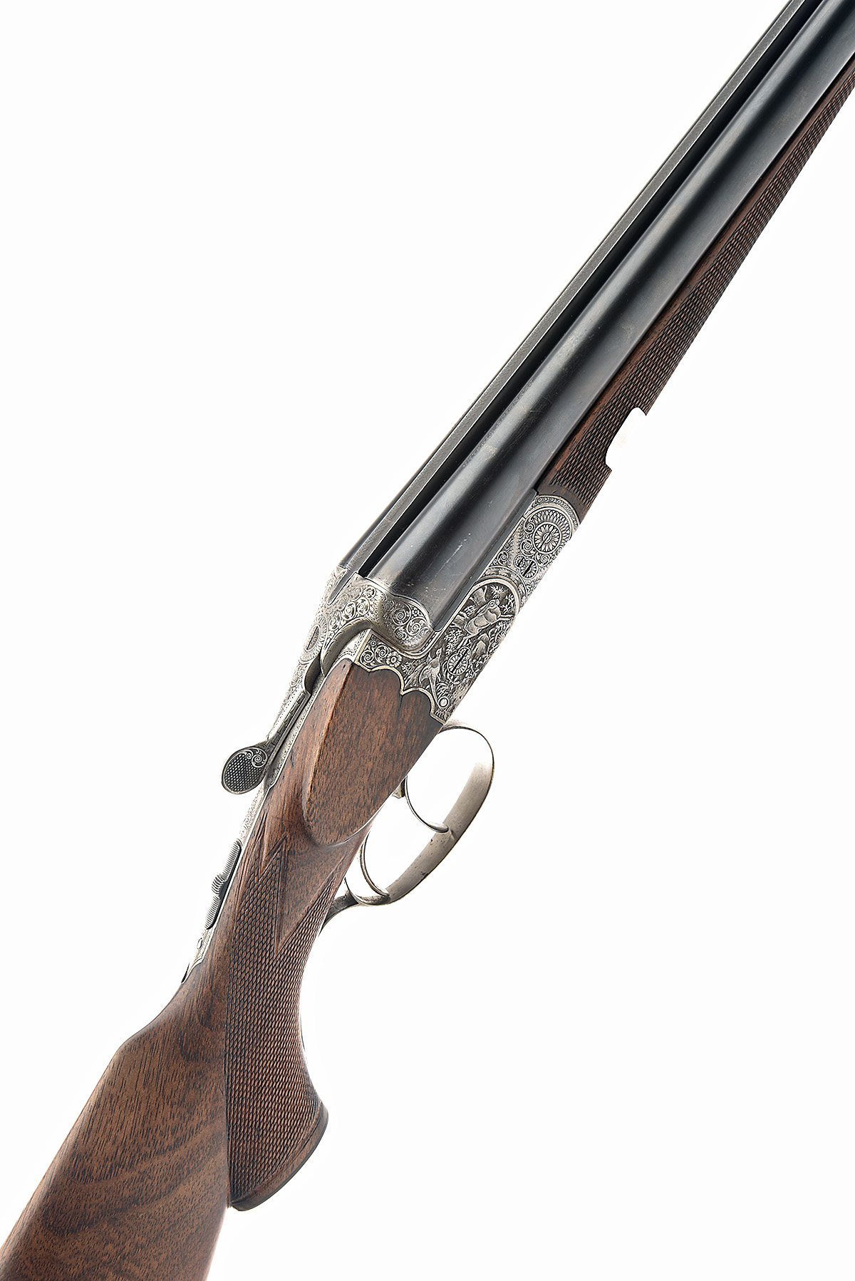 AN AUSTRIAN 16-BORE BOXLOCK NON-EJECTOR, marked Benedikt Winkler, serial no. 301., circa 1925, 27 7/8in. sleeved nitro barrels retaining original file-cut rib, the tubes later engraved 'BENEDICT WINKLER FERLACH.' (sic), 2 1/2in. chambers, bored approx. 1/4 and 1/2 choke, scroll-back treble-grip action with side-clips, automatic safety, the action flats double stamped 'BENEDIKT WINKLER FERLACH' (possibly later), bold Germanic scroll engraving surrounding game scenes of hare, hound and fowl on a matted background, 14 1/2in. pistolgrip stock with cheekpiece, pistolgrip-cap, sling swivels and including 1/2in. recoil pad, weight 6lb.