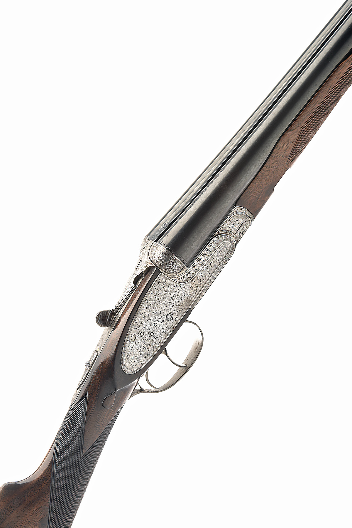 ARMAS EGO 12-BORE HAND-DETACHABLE SIDELOCK EJECTOR, serial no. 62648, dated 1977, 27in. nitro barrels (pits and dents), 2 3/4in. chambers, bored approx. 1/4 and 1/2 choke, treble-grip action with hidden third bite, removable striker discs, automatic safety with gold-inlaid 'S detail, hand detachable lockplates, cocking-indicators, articulated front trigger, border and acanthus scroll engraving, 15 1/4in. stock including 3/4in. extension, weight 6lb. 11oz.