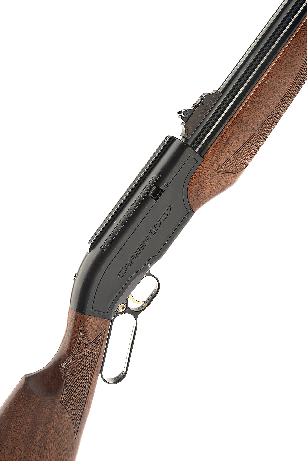 A .22 PRE-CHARGED PNEUMATIC AIR-RIFLE, SIGNED SHIN SUNG 'MODEL CAREER III 707' serial no. 551983, with shrouded 23 1/2in. barrel threaded for a sound moderator, ramped blade fore-sight,open rear sight, cast receiver with lever action operation and detachable magazine, manual safety, chequered butt-stock with fore-end, 13 1/2in. pull including rubber recoil pad, double under-barrel air-chamber, untested