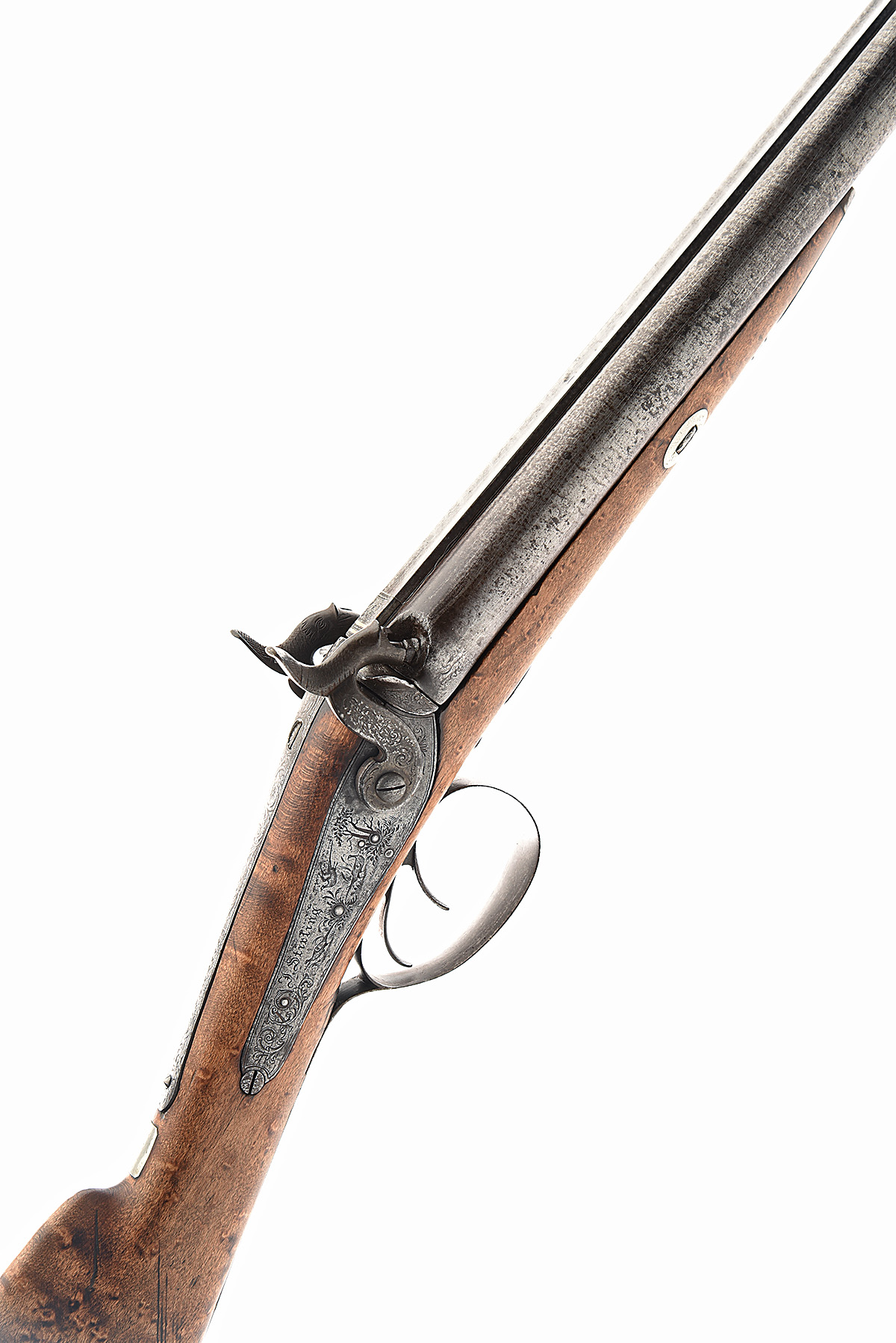 A 12-BORE PERCUSSION DOUBLE BARRELLED SPORTING GUN BY STIRLING, CIRCA 1850, no visible number, 28 in. skelp twist barrels with two inset gold lines at breech and engraved with gamebirds, foliate engraved long fixed breech tang, borderline engraved back-action locks also attractively decorated with gamebird and hunting scenes, half stocked in maple with engraved iron mounts, worn overall, top rammer pipe and rod missing.