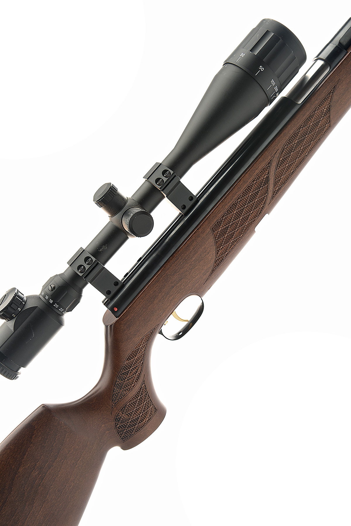 A .177 UNDER-LEVER COCKING AIR-RIFLE, SIGNED WEIHRAUCH FOR HULL CARTRIDGE 'MODEL HW97K', serial no. 1892809, 14 1/2in. barrel including sound moderator, receiver fitted with an unsigned 6-24x50 AOE telescopic sight, manual safety, gold-washed trigger, chequered pistolgrip halfstock with cheekpiece, 14 1/4in. pull including rubber recoil pad