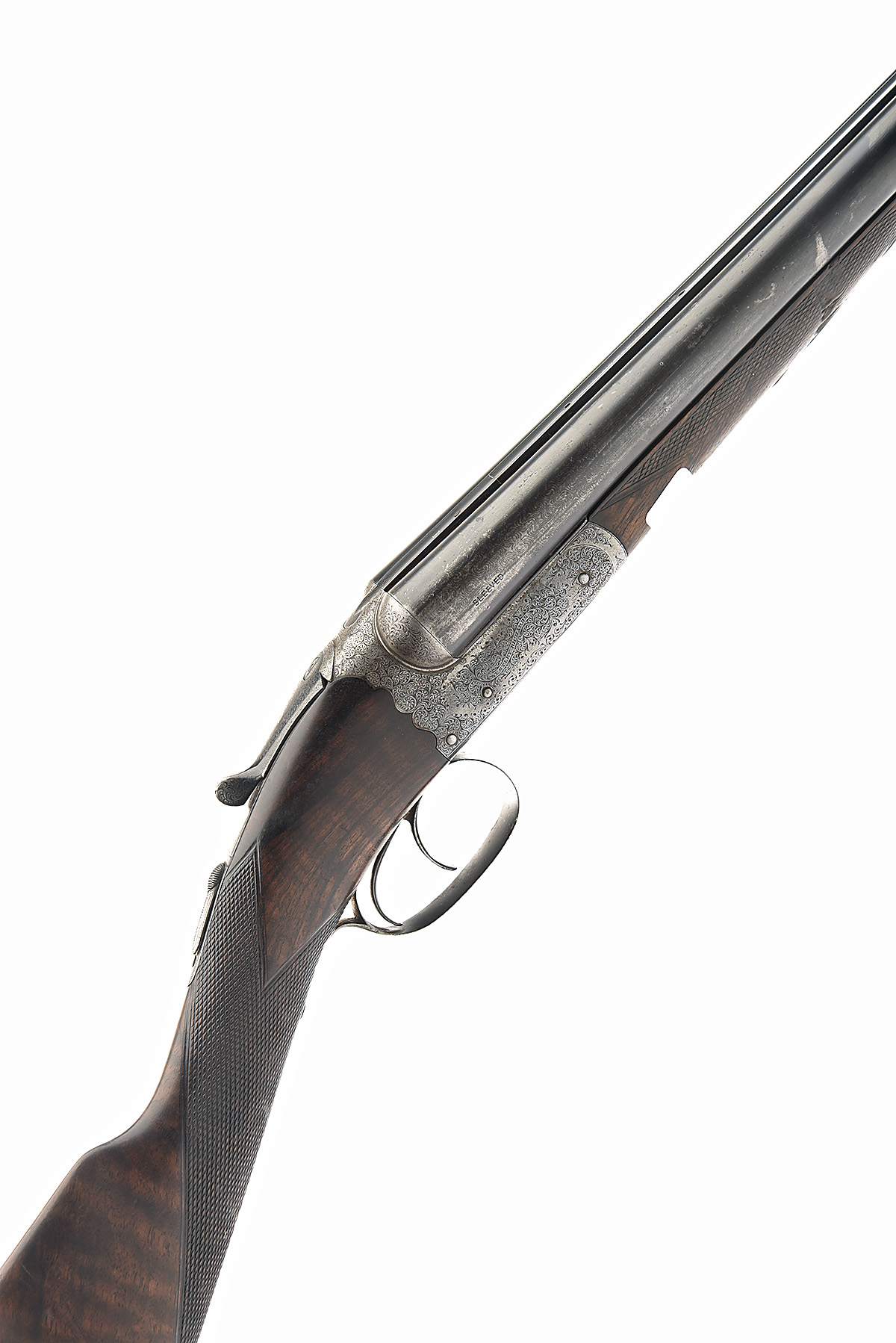 WESTLEY RICHARDS 12-BORE (CROSSOVER) BOXLOCK EJECTOR, serial no. 14861, circa 1891, 30in. sleeved nitro barrels, 2 1/2in. chambers, bored approx. 1/2 and full choke, scroll-back action, toplever gold-inlaid '1', automatic safety with gold-inlaid 'SAFE' detail, border and acanthus scroll engraving, 13 1/2in. figured crossover stock