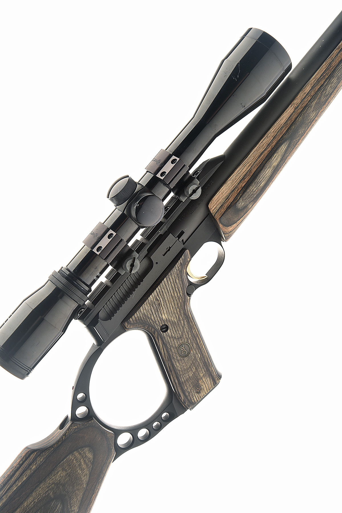 BROWNING .22 L.R. 'BUCK MARK' SELF-LOADING SPORTING RIFLE, serial no. 213MW02258, circa 2014, 18in. unsighted nitro barrel, fitted with a Vistascope 4x40 telescopic sight, manual safety, gold washed trigger, detachable magazine, green laminated pistolgrip stock