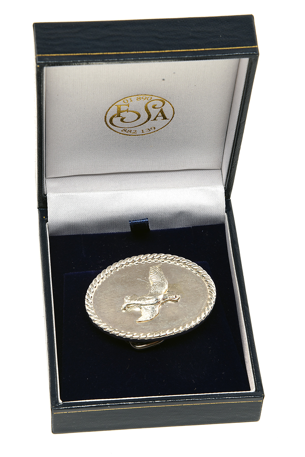 A SMALL SILVER AND STEEL BELT BUCKLE WITH A GROUSE MOTIF, un-hallmarked silver with steel keeper, in a box