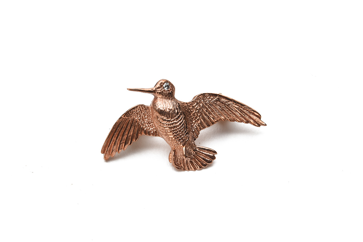 A SMALL ROSE-GOLD LOST WAX WOODCOCK PIN FEATHER BROOCH OR CAP BADGE,