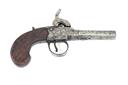 A .42 PERCUSSION BOXLOCK POCKET PISTOL BY WILLIAM PENN & CO. CIRCA 1815, no visible serial number, with 2 1/2 in turnoff barrel, boxlock action engraved with martial trophies and the retailers name 'WILLIAMS / PENN & CO.' central hammer with sliding bar safety, fitted with one piece walnut slab sided grips, the pistol was originally made as a flintlock circa 1815 and converted to percussion at a later date.