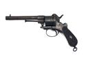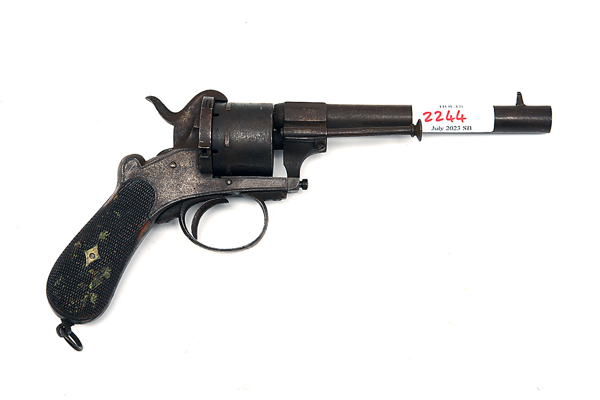 AN 11 MM PINFIRE LEFAUCHEUX TYPE DOUBLE ACTION REVOLVER, RETAILED BY W. NEEDLER, CIRCA 1870, no visible serial number, with two stage octagonal to round 6 in Birmingham proofed barrel, borderline engraved open top frame, fitted with cartridge ejector rod and hinged loading gate, plain six shot cylinder and chequered two piece walnut broom handle style grips, the gun is dirty overall with some traces of finish, action slightly at fault, probably trigger return spring.
