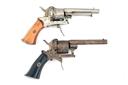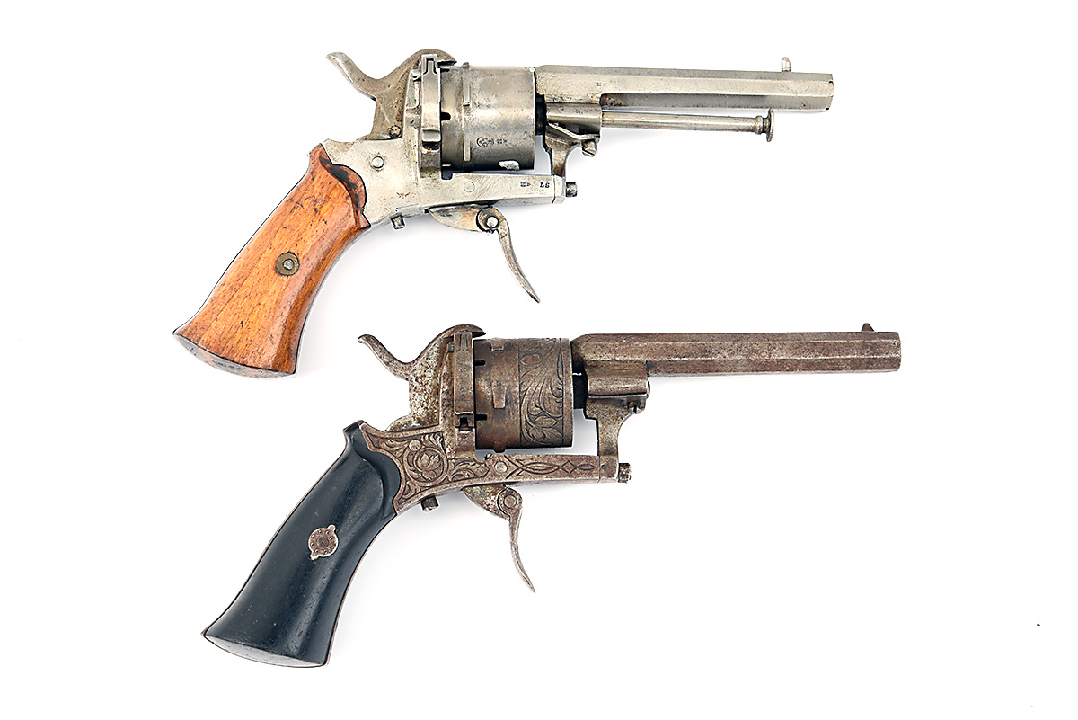 TWO 7 MM PINFIRE LEFAUCHEUX TYPE DOUBLE ACTION POCKET REVOLVERS FOR RESTORATION, CIRCA 1870, no visible serial numbers, both almost identical, one with a 3 1/4 in octagonal barrel. plain open top frame with ejector rod and hinged loading gate, plain six shot cylinder, folding trigger and two piece walnut grips, action at fault, the other with 3 1/2 in octagonal barrel open top frame foliate engraved in relief, with hinged loading gate, cartridge ejector rod missing, six shot cylinder engraved to match, two piece ebony grips, action at fault, probably trigger return spring.