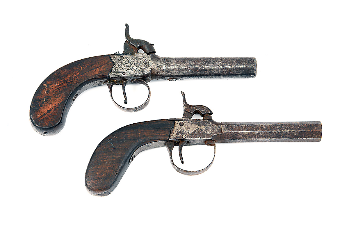 TWO PERCUSSION BOXLOCK POCKET PISTOLS, CIRCA 1840, no visible serial numbers,