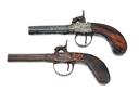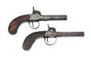TWO PERCUSSION BOXLOCK POCKET PISTOLS, CIRCA 1840, no visible serial numbers, the first of .45 in. calibre with 3 in. octagonal barrel, plain boxlock action, one piece walnut bag shaped grips, the second of .46 in. calibre with 3 1/2 in. round turnoff barrel, foliate engraved boxlock action bearing retailers name 'R. DOBSON', one piece walnut slab sided grips.