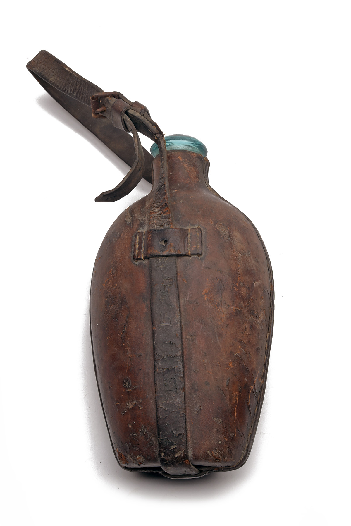 * A RARE DANISH ARMY GLASS WATER BOTTLE, circa 1850, green glass bottle tightly sewn into a brown leather case together with its original carrying strap, the number '704' crudely carved into the leather case and various faint stamped numbers appear in the strap itself and are presumably unit details that may revive with treatment, buckle rusted and leather dry, these were not issued with caps, a simple cork being used, a little separation with the stitching and no chips to the glass, 9 in. length; a rare survivor