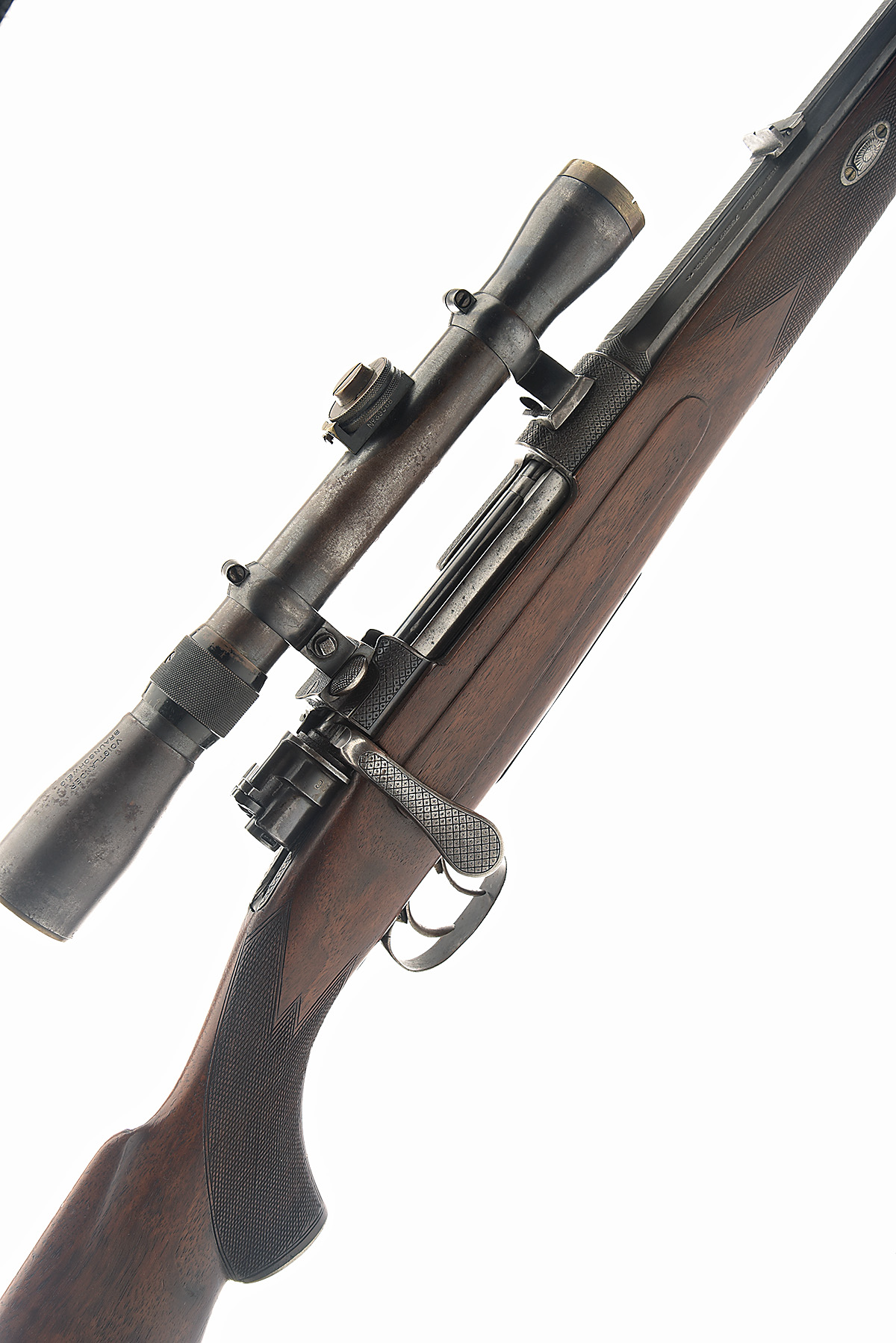 * SIMSON & CO. - SUHL 8x57I BOLT-MAGAZINE STUTZEN SPORTING RIFLE, serial no. 22215, circa 1905, 23 3/4in. turned octagonal to round nitro reproved (in 2023) barrel, file-cut rib engraved 'SIMSON & CO. SUHL. WAFFENFABRIKEN' and with ramped fore-sight, open rear sight with one folding leaf, engraved 'FLUSS-STAHL KRUPP-ESSEN', receiver fitted with a Skopar F 4 1/2x telescopic sight marked 'VOIGTLANDER BRAUNSCHWEIG.', in quickly-detachable claw mounts, manual flag safety, double-set triggers, military-style detachable floorplate, turned down butterknife bolt, diamond and star engraving, full-length pistolgrip stock with cheekpiece and pistolgrip cap, sling swivels, 14 3/4in. pull including trademark buttplate, sling swivels, weight 7lb. 7oz. (unscoped) and 8lb. 9oz. (scoped)