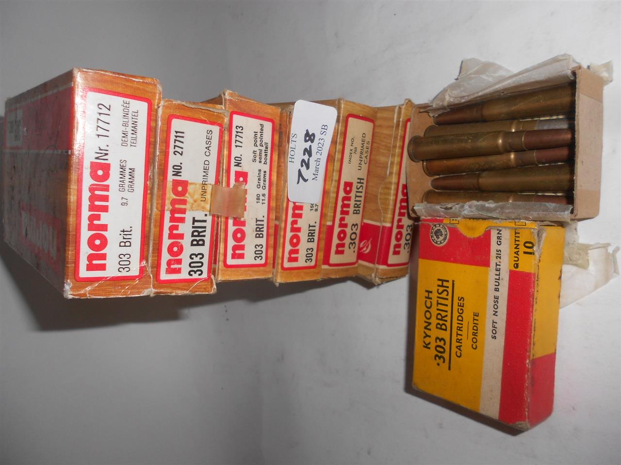 120 NORMA .303 CASES, SOME PRIMED, WITH 6 ASSORTED .303 HUNTING ROUNDS BY KYNOCH, NVBN Please be advised that cartridges/ammunition, primers, primed cases, blanks and percussion caps cannot be sent or exported to you by post or carrier. Due to this rule, within 30 days of the sale date, please arrange with our shipping department a collection at one of our regional valuation days on mainland UK, or, you would be most welcome to collect from our offices at PE31 6HA in Norfolk. If collection is not arranged within 30 days, that will indicate that the items are not required and they will be offered in our next sale.