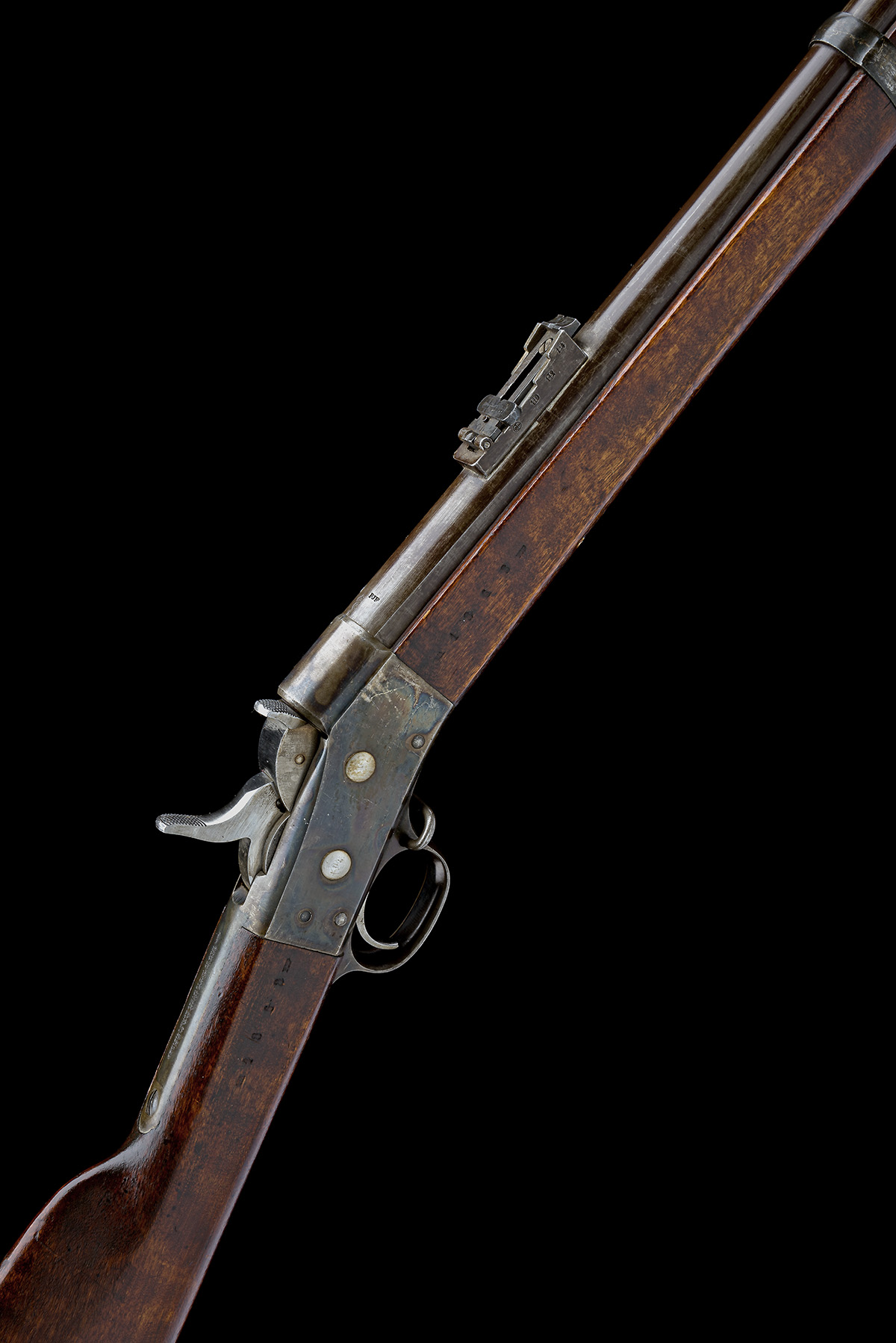 circa 1870, with blued round 37 1/2in. barrel, block and blade fore-sight, elevating ladder rear-sight, Carl Gustav barrel-maker's mark at breech, colour hardened rolling-block action with central hammer, the top-tang with Remington's address and patents to 1866, walnut butt-stock with carbine style heel-plate, full-length fore-end with three iron barrel-bands and jag-ended iron clearing rod, much finish remaining