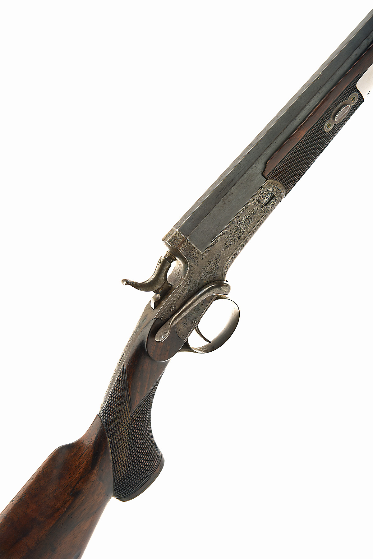 JNO. RIGBY & CO. .410 (SMOOTHBORED) SINGLE-BARRELLED SIDELEVER HAMMER ROOK RIFLE, serial no. 14144, circa 1870 and likely converted from needle-fire, 24in. turned octagonal to round nitro reproved blacked damascus barrel, the top flat engraved 'Jno. RIGBY & CO. 72 ST. JAMES'S. STREET. LONDON. AND AT DUBLIN.', rear sight removed and dove-tail inserted, and with acanthus scroll detailing at the breech-end, 2 1/2in. chamber, bored approx. 1/4 choke, central non-rebounding hammer, sidelever opening, border and acanthus scroll engraving, retaining very slight traces of original colour-hardening and finish, 14 1/2in. figured pistolgrip stock with horn pistolgrip cap and including steel buttplate, splinter fore-end with cross-pin release catch, weight 4lb. 6oz.