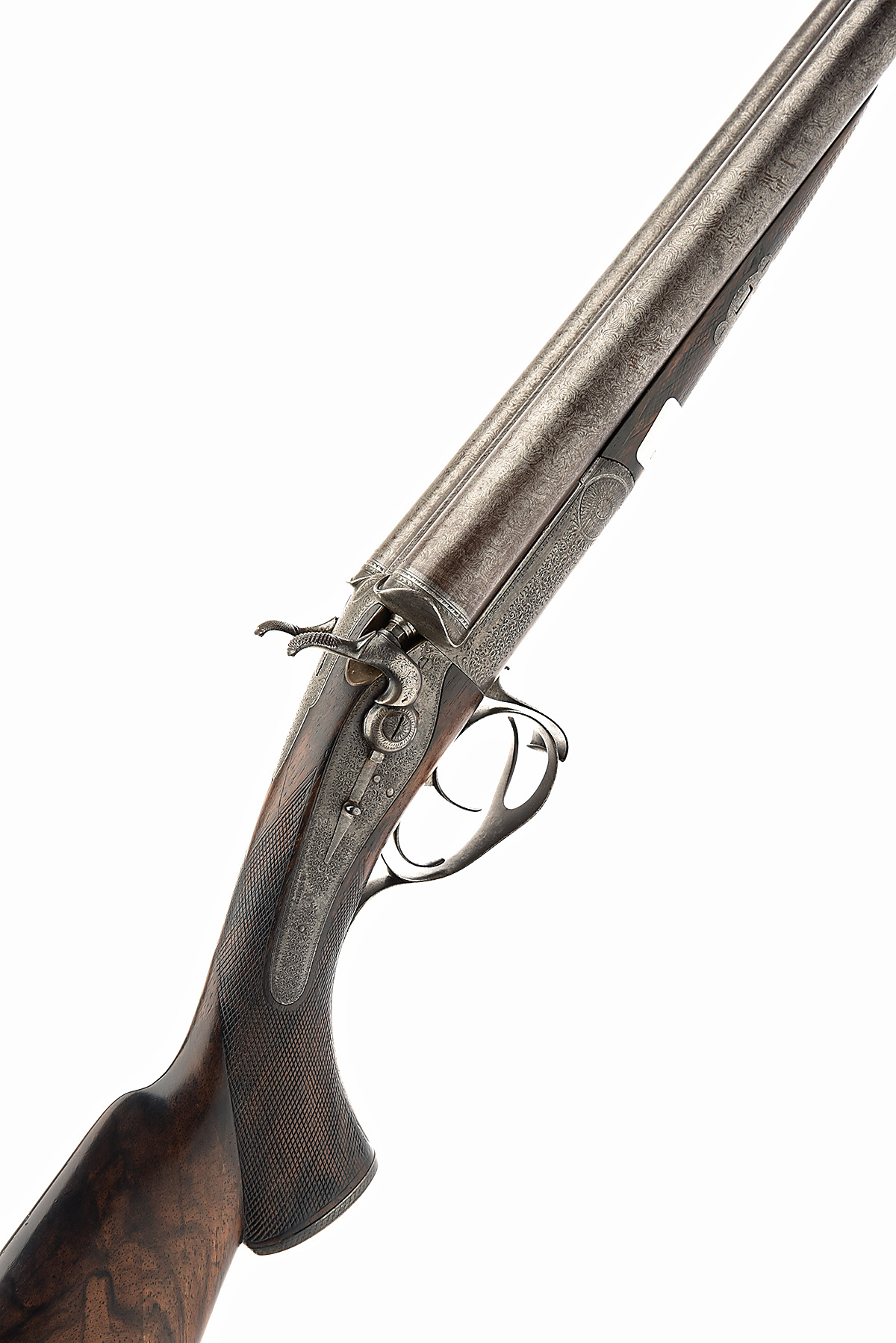 S. GRANT 16-BORE PURDEY 1863 (SECOND PATTERN) THUMBHOLE-UNDERLEVER HAMMERGUN, serial no. 2713, 27in. black powder only bold damascus barrels (pitted, left wall at 19), sunken rib engraved 'S. GRANT. 67A. ST. JAMES'S STREET. LONDON.', 2 1/2in. chambers, bored approx. true cyl. choke in both, possible conversion from pinfire, carved serpentine fences, non-rebounding back-action locks with bolted hammers of hare's-ear form (one replaced), Purdey patent thumbhole underlever, patent no. 1104 of 1863 (second pattern), use number 293, fine acanthus scroll engraving, retaining very slight traces of original colour-hardening, 14 1/2in. pistolgrip stock with engraved steel pistolgrip-cap and steel buttplate, insert repair at toe and plug (from removed sling eye), weight 5lb. 8oz.