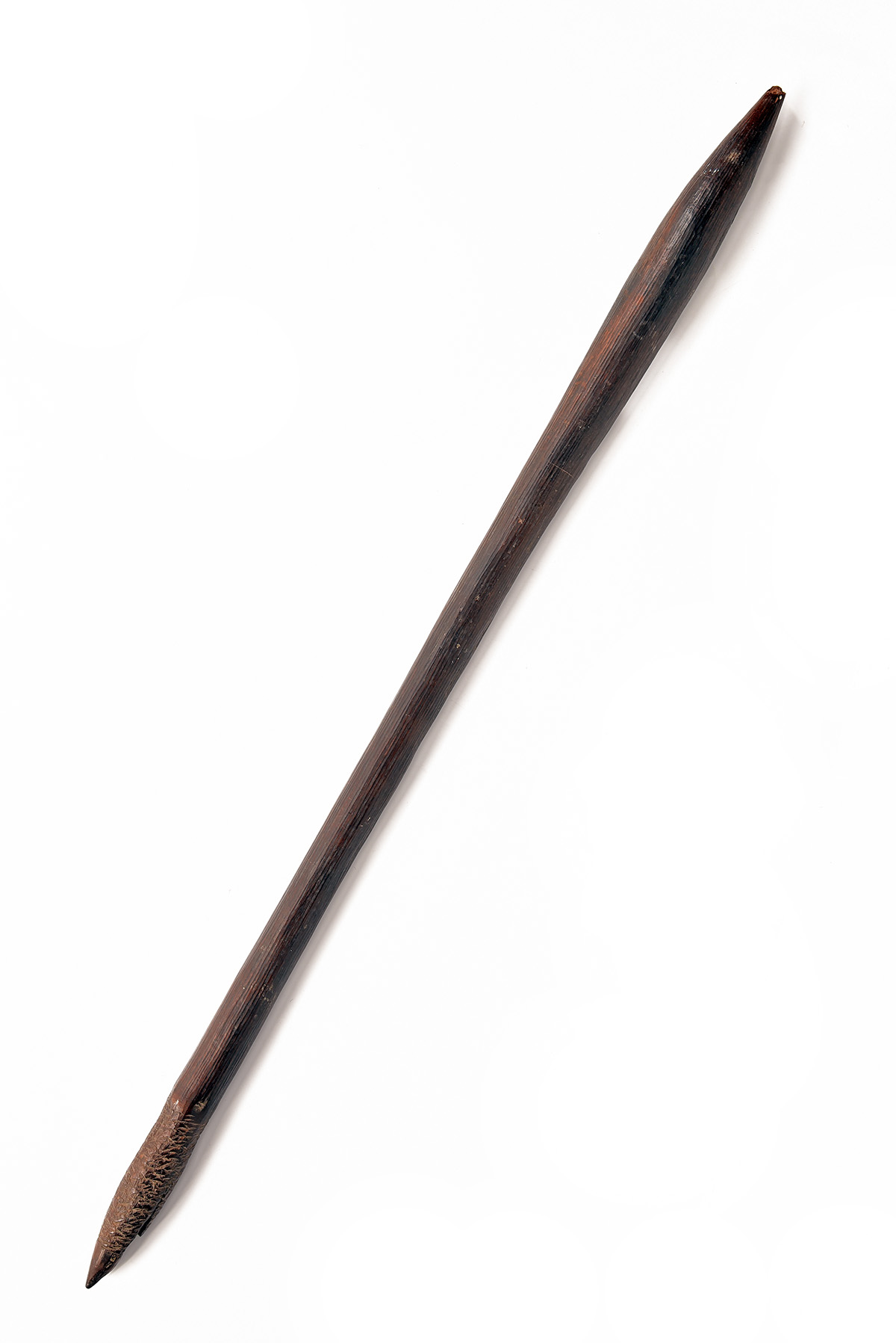 A NATIVE HARD-WOOD THROWING STICK OR CLUB, circa late 19th Century, probably Aboriginal Western Australia, with tapered ends and shallow longitudinal fluting, the smaller end with carved patterning where it would be held, the larger club end missing its tip, 27 1/2 in. length