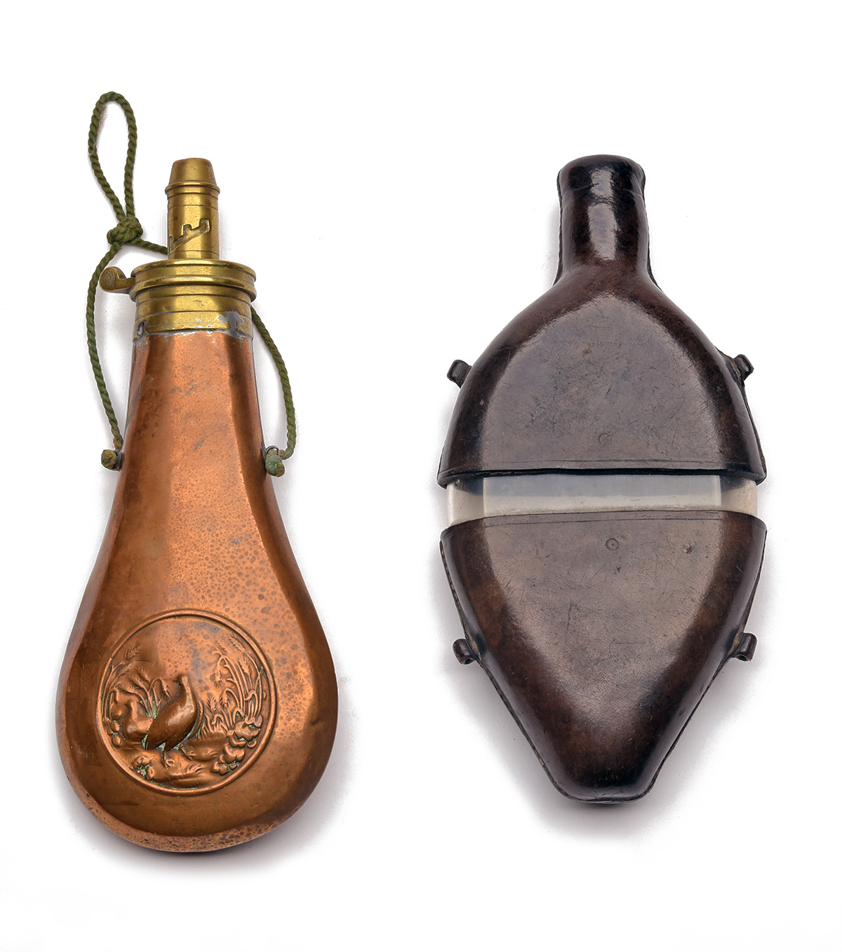 * A RARE EARLY GLASS SADDLE-FLASK AND A COPPER AND BRASS POWDER FLASK BY BARLOW, circa 1820, clear glass with cork stopper, shell leather case with loops for strapping, the top section would slide up the strap to allow access to the flask, stitching tight, 7 1/2 in. length, together with a circa 1860, of flattened bag shape, embossed scene of game birds on both sides, graduated spout, fireproof cap marked 'JAMES BARLOW & Co / BIRMINGHAM / IMPROVED PATENT', two suspension loops, soldered repair attaching cap to body, some shallow denting, 8 1/4 in.