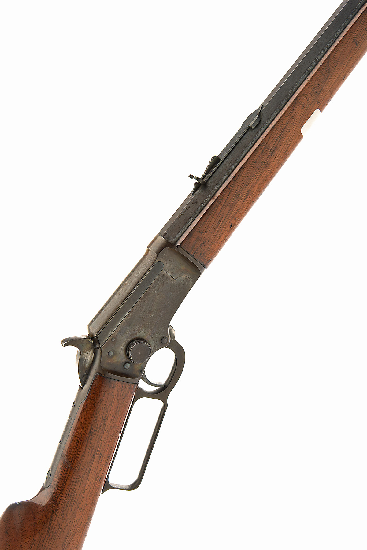 MARLIN FIRE-ARMS CO. .22 L.R. 'MODEL 1897' LEVER-ACTION TAKE-DOWN REPEATING SPORTING RIFLE, serial no. 205881, for 1900, 24in. nitro reproved octagonal barrel (in 2024), blade fore-sight, adjustable open rear sight, detachable full-length tubular magazine, take-down action with half-cock hammer safe, retaining traces of original colour-hardening and finish, 13 1/4in. pull including trademark buttplate, weight 5lb. 12oz.