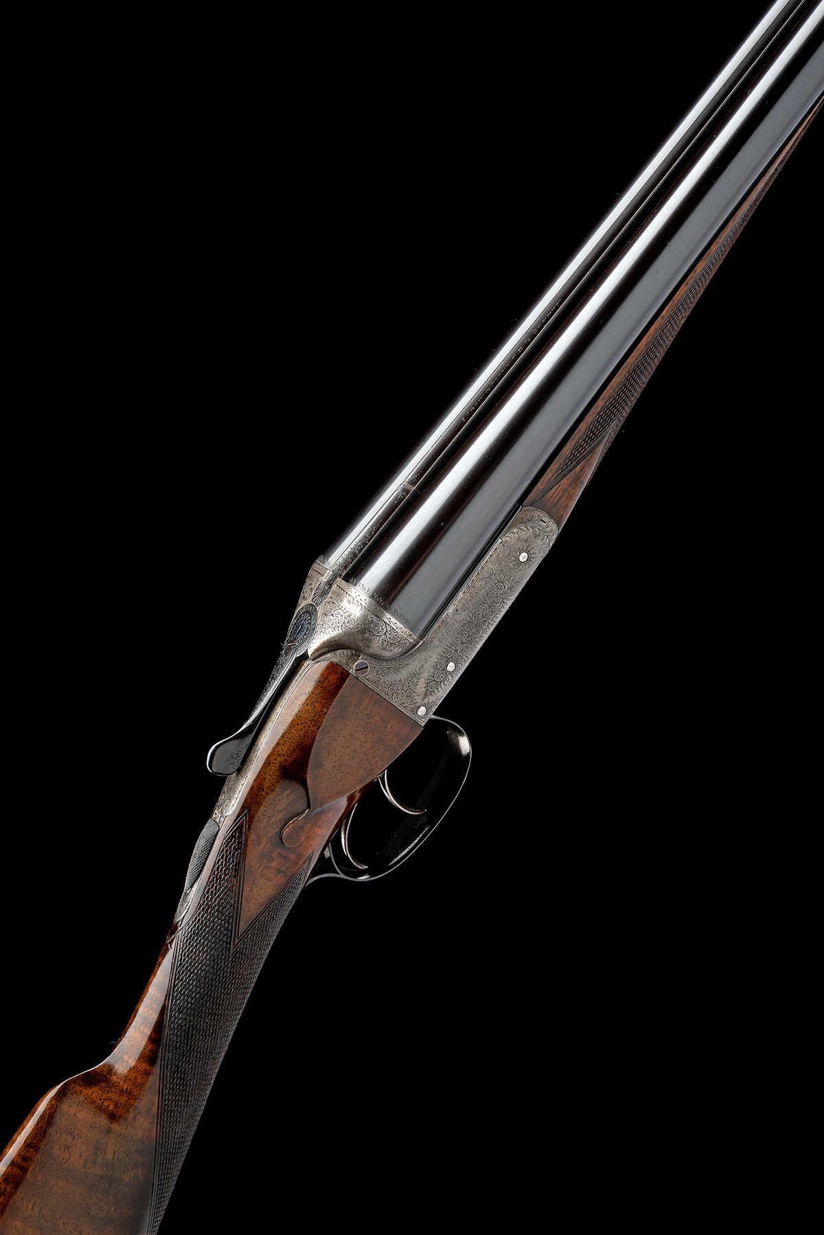 circa 1900, 30in. nitro barrels (some pits and marks), rib engraved 'ARMY & NAVY C.S.L. LONDON.', 2 1/2in. chambers, bored approx. true cyl. and full choke, treble-grip action, intercepting sears, toplever engraved 'PATENT', safety with blue-enamelled 'SAFE' detail (safety requires attention, currently frozen to "on" position), border and acanthus scroll engraving, retaining traces of original colour-hardening and finish, 15 1/8in. figured replacement stock, weight 6lb. 7oz.