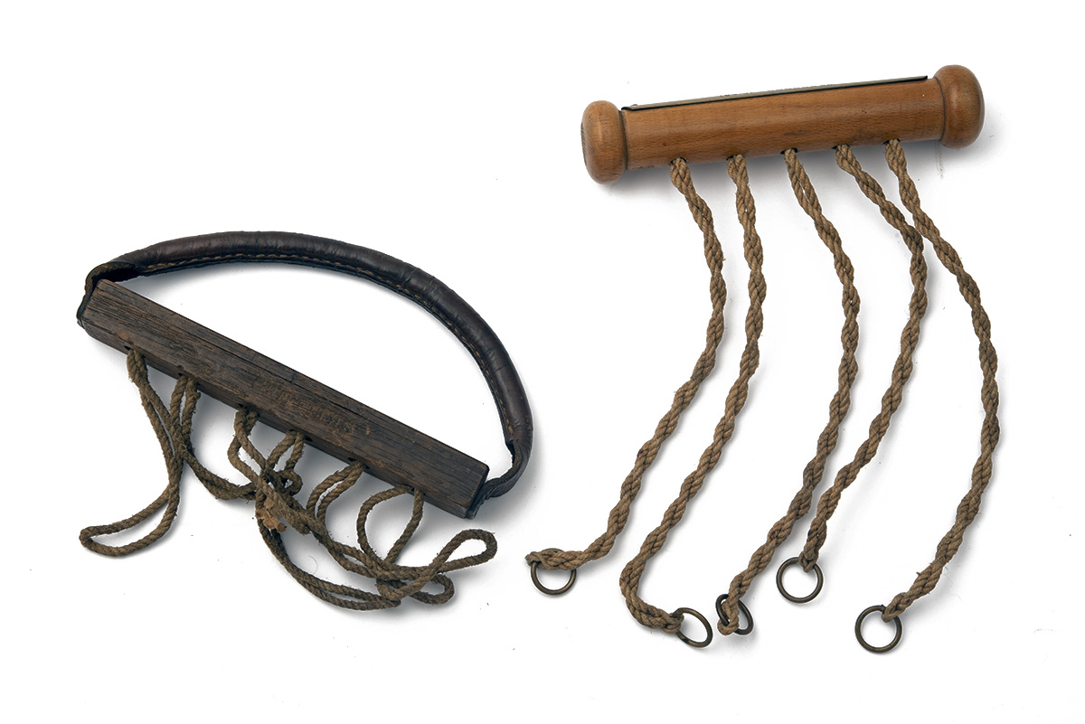 A GOOD PAIR OF VICTORIAN GAME CARRIERS, mid-late 19th Century, 1) box-wood with five ropes, attached brass plaque marked 'Rd. 220860 (E.A.B) / THE MARWOOD / LIGHTWOOD & SON BIRMINGHAM', the other wood and leather with six ropes, stamped each side with 'GRIFFITHS'
