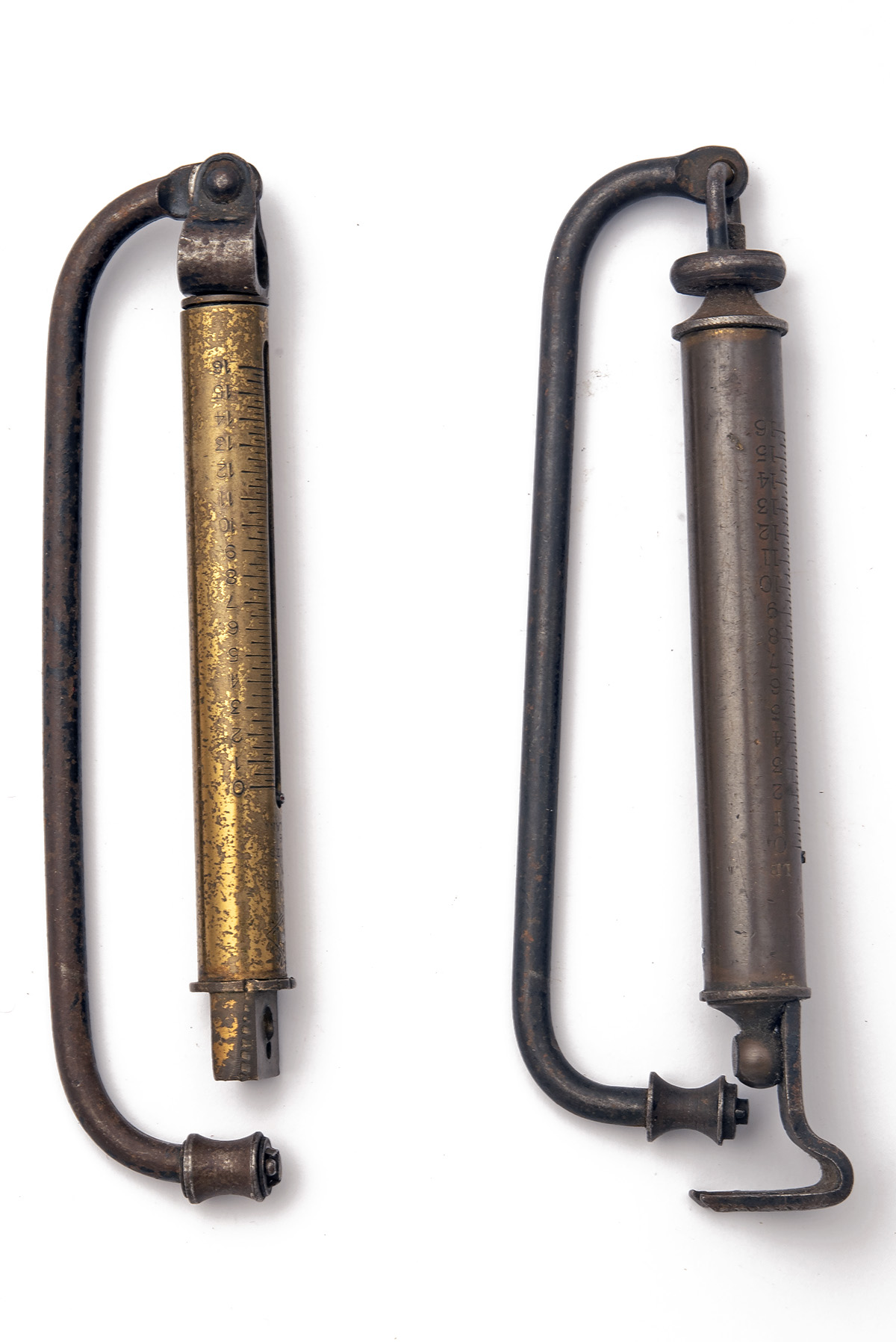 A RARE PAIR OF BRASS ORDNANCE SPRING BALANCES, ONE FOR THE LEWIS MG, 1) early 20th Century spring balance combination tool for the Lewis Machine Gun made by Salter, with Ordnance Broad arrow above the Salter trade-mark; 2) a trigger pull spring balance dated 1955 by Hill with Ordnance Broad Arrow mark