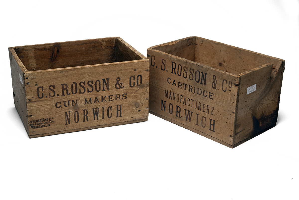 A PAIR OF WOODEN CARTRIDGE TRANSPORTATION CRATES FOR ROSSON OF NORWICH, circa mid 20th Century both with heat-impressed branding, one with both long sides marked 'C. S. ROSSON & Co. / CARTRIDGE / MANUFACTURERS / NORWICH', 14 1/4 in. x 9 1/4 in. x 8 3/4 in., wormed and one end panel with a large knott-hole; the other with both long sides marked C. S. ROSSON & CO / GUN MAKERS / NORWICH' with a smaller mark in bottom left corner stating 'JEWSON & SONS Ltd. / BOX & CASE MAKERS / NORWICH', external sides polished, external base painted white, a few worm holes, 14 in. x 10 3/4 in. x 8 in. (2)