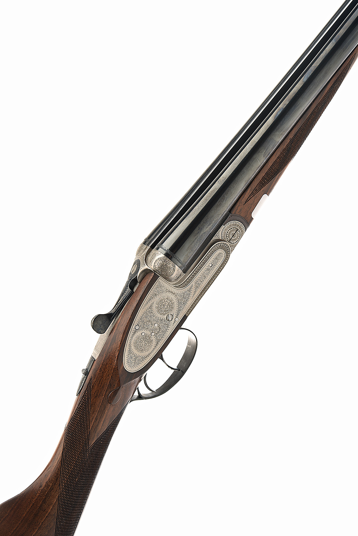 ARMAS PARKEMY 12-BORE 'DENTON & KENNELL' HAND-DETACHABLE SIDELOCK EJECTOR, serial no. 70829, dated 1983, 25in. nitro barrels, 2 3/4in. chambers, bored approx. imp. cyl. in both, removable striker discs, automatic safety, hand-detachable lockplates, cocking-indicators, articulated front trigger, border and acanthus scroll engraving with floral bouquets, 15in. stock, weight 6lb. 15oz., in a brown canvas and leather gunslip