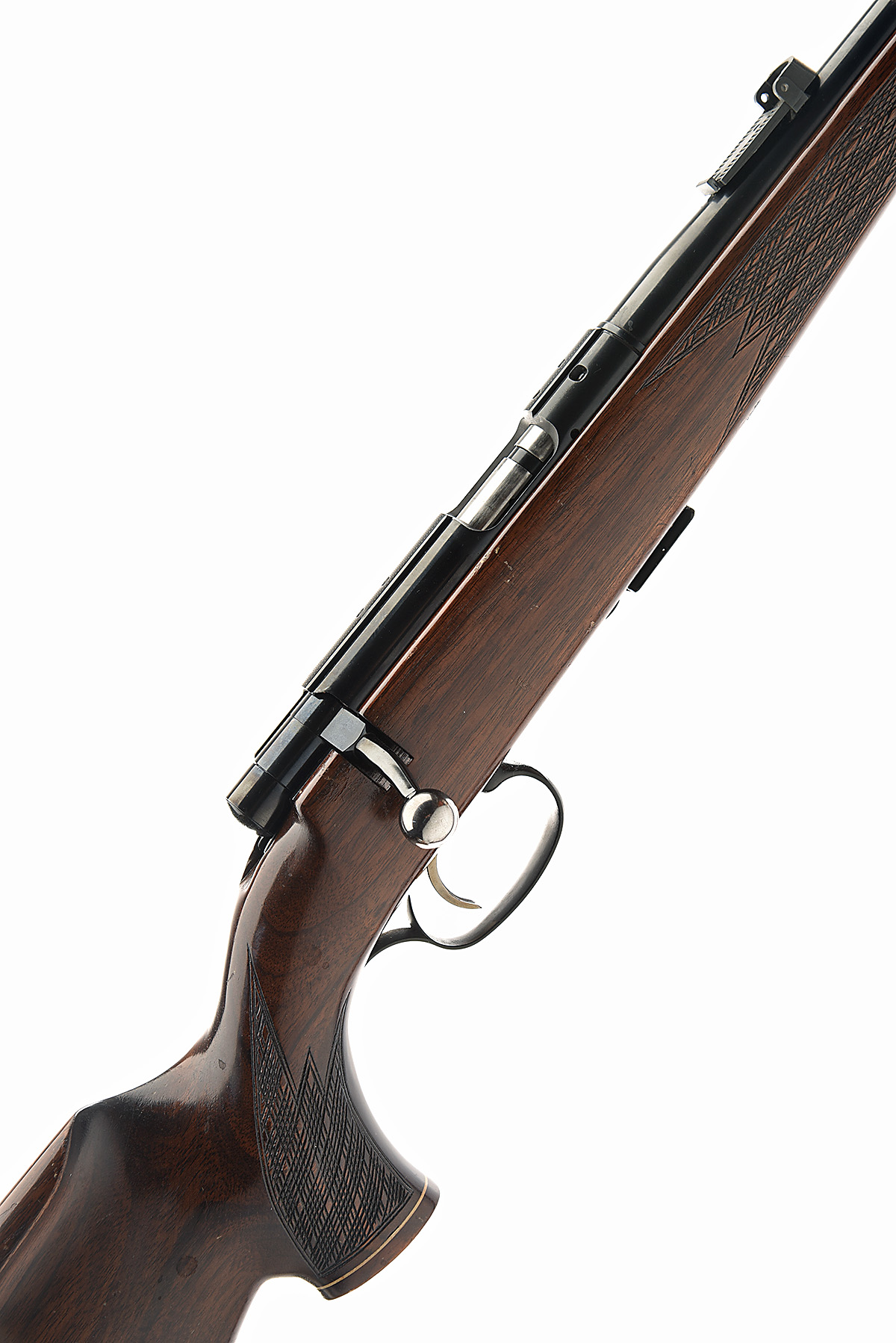 J.G. ANSCHUTZ .22 L.R. 'MODEL 1422' BOLT-MAGAZINE SPORTING RIFLE, serial no. 1124705, circa 1977, 24in. nitro barrel, ramp-mounted bead fore-sight, rear-sight missing, manual flag safety, detachable magazine, figured pistolgrip stock with cheekpiece, leather sling