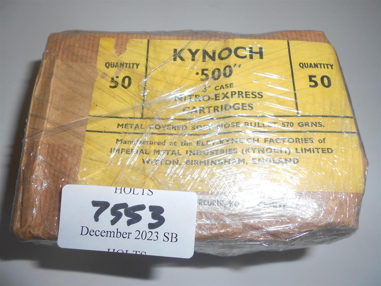 30 ROUNDS .500 x 3in. NITRO EXPRESS BY KYNOCH, 570 GRN METAL COVERED SOFT NOSE BATCH 27JD Please be advised that cartridges/ammunition, primers, primed cases, blanks and percussion caps CANNOT BE SENT ANYWHERE in the UK or EXPORTED OVERSEAS by POST or CARRIER. Due to this NATIONAL and INTERNATIONAL CARRIER rule, within 30 days of the sale date, please arrange collection with our shipping department from our Norfolk HQ. If payment and collection is not arranged within 30 days of the sale date, that will indicate that the items are not required and they will be disposed of.