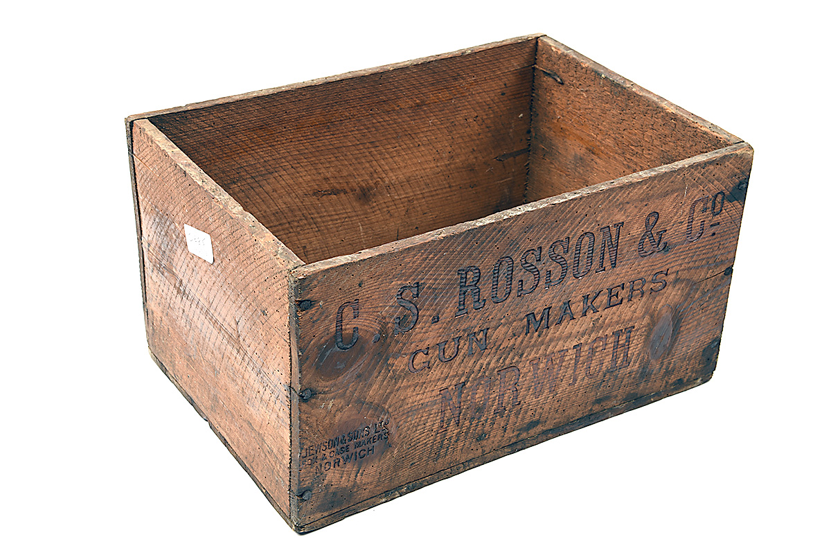 A WOODEN TRANSPORTATION CRATE FOR ROSSON & Co., circa mid 20th Century, with both long sides impressed with 'C. S. ROSSON & Co. / GUN MAKERS / NORWICH', with a smaller stamping in the bottom left corner 'JEWSON & SONS Ltd / BOX & CASE MAKERS / NORWICH', nailed construction, solid but wormed, 15 3/4 in. x 10 1/4 in. x 8 1/2 in.
