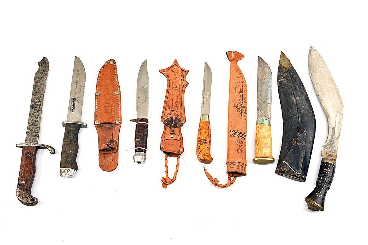 A GROUP OF SIX MIXED BLADED ITEMS, includes a shortened Argentine Model 1909 Infantry NCO's machete, a tourist kukri, a Dive Dynamics diving knife, all in mixed condition, plus three modern and apparently unused tourist pieces in leather scabbards
