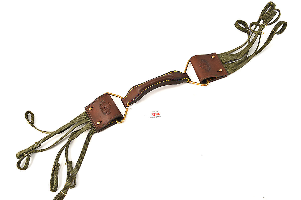 A VIRTUALLY NEW AND UNUSED ELS & CO. 'THE BARBETON' CARRIER HANDLE & GAME CARRIER, hand-stitched handle with wax-coated cotton thread, two brass D-rings with detachable canvas and leather game carriers, each for six birds