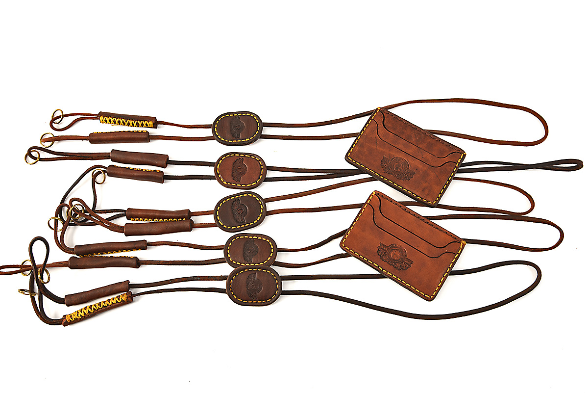 FIVE VIRTUALLY NEW AND UNUSED ELS & CO. LEATHER DOUBLE LANYARDS, TOGETHER WITH TWO 'THE WITWATERSRAND' LEATHER WALLET II with hand-stitched wax-coated cotton thread and brass rings (7)