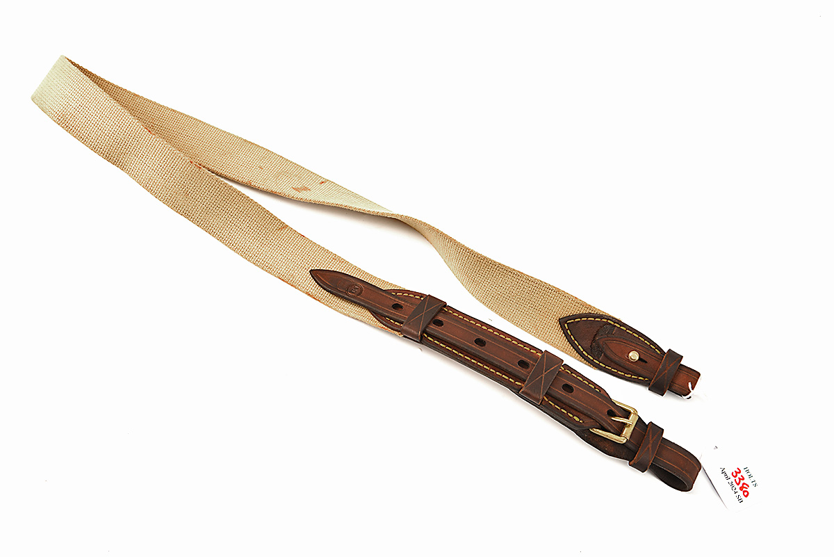 A VIRTUALLY NEW AND UNUSED ELS & CO. 'THE GRAAF-REINET' CANVAS AND LEATHER RIFLE SLING, hand-stitched handle with wax-coated cotton thread, 1 1/2in. wide canvas, brass fittings, overall length approx. 43in., some marking to the canvas
