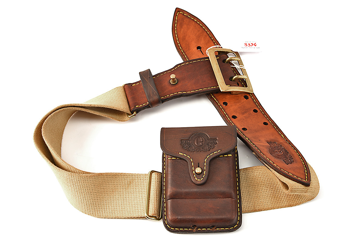 A VIRTUALLY NEW AND UNUSED ELS & CO. 'THE HOGSBACK' CANVAS AND LEATHER HUNTING BELT AND 'RHODES CLASSIC' EUROPEAN SMALL CARTRIDGE POUCH, large adjustable canvas and leather belt with 2in. wide strap, hand-stitched leather with wax-coated cotton thread, brass fittings, some marking to the canvas, detachable cartridge pouch with provision for five European small sized rounds, flip-up lid with brass fittings (2)