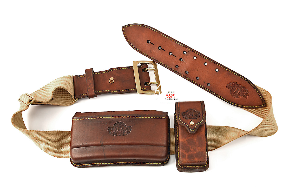 A VIRTUALLY NEW AND UNUSED ELS & CO. 'THE HOGSBACK' CANVAS AND LEATHER HUNTING BELT AND ACCESSORIES, large adjustable canvas and leather belt with 2in. wide strap, hand-stitched leather with wax-coated cotton thread, some marking to the canvas, brass fittings, complete with Els & Co. 'The Somerset double' detachable open-top cartridge pouch with provision for six European small sized rounds, and 'Milnerton' multi-tool pouch (3)