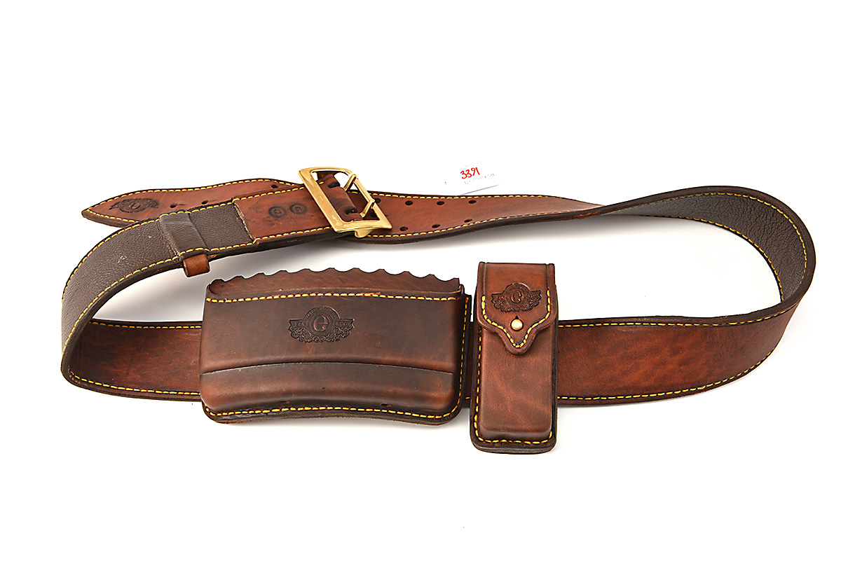 A VIRTUALLY NEW AND UNUSED ELS & CO. 'THE HOGSBACK' LEATHER HUNTING BELT AND ACCESSORIES, belt sized '42' with 2 1/4in. wide strap, hand-stitched leather with wax-coated cotton thread, brass fittings, together with 'The Somerset' open-top leather cartridge pouch with provision for ten European large rounds, with leather top-loops and elastic internal loops, with belt loops to rear, and 'Milnerton' multi-tool pouch (3)