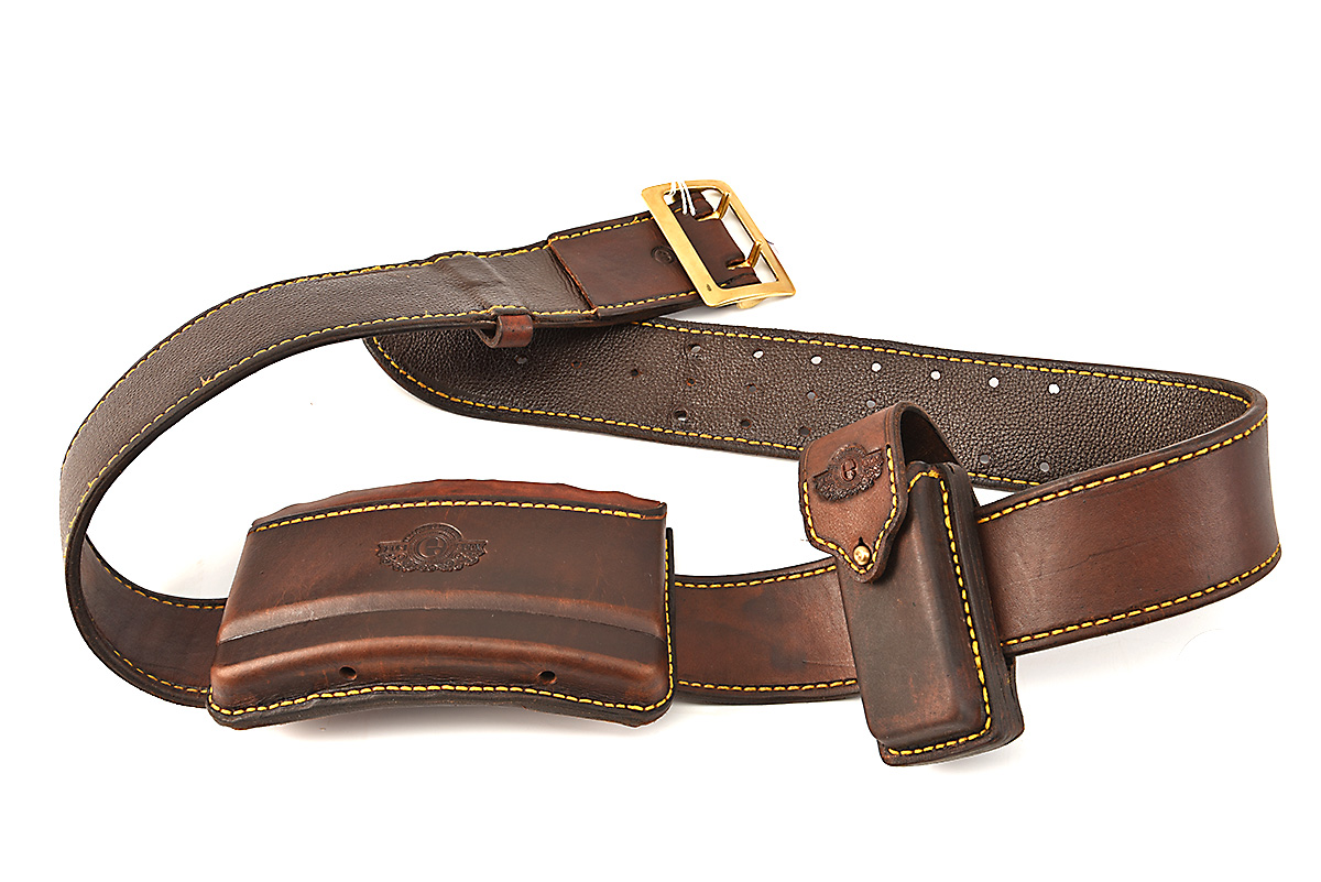 ELS & CO. A VIRTUALLY NEW AND UNUSED 'THE HOGSBACK' LEATHER HUNTING BELT AND ACCESSORIES, belt size '40' with 2 1/4in. wide strap, hand-stitched leather with wax-coated cotton thread, brass fittings, together with 'The Somerset double' open-top leather cartridge pouch with provision for six European large rounds, with leather top-loops and elastic internal loops, with belt loops to rear, and 'Milnerton' multi-tool pouch